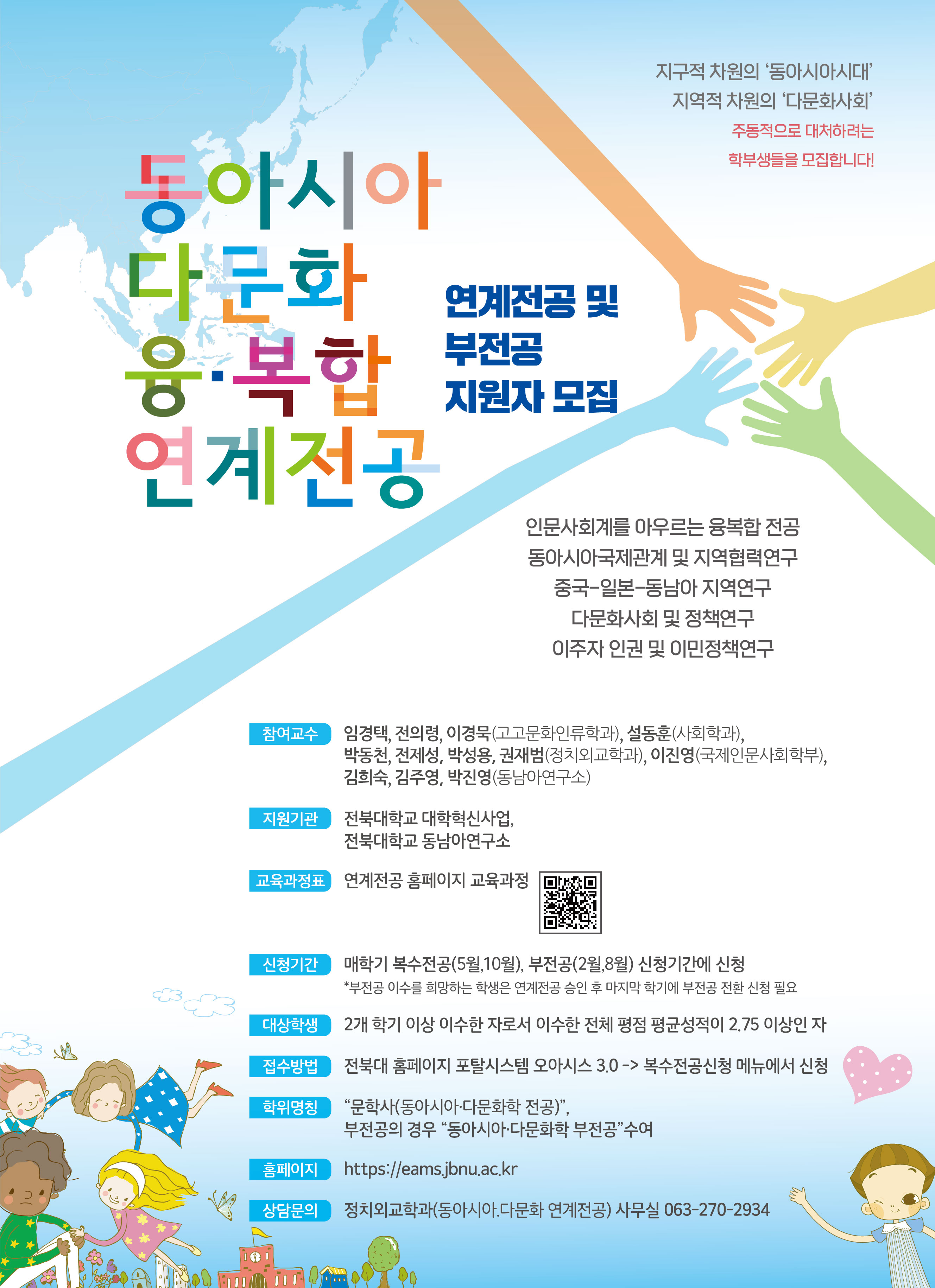 교과과정 등 동아시아다문화 연계전공에 자세한 내용은 홈페이지( https://eams.jbnu.ac.kr/)에서 확인할 수 있습니다.